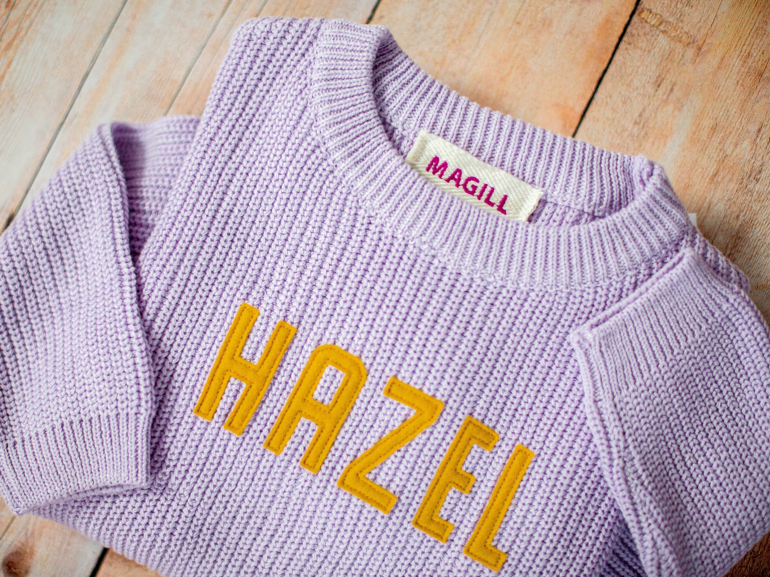 Sweater is made from 100% cotton and super soft to the touch. Each wool letter is stitched individually for an heirloom custom look, perfect for a baby shower gift, birthday gift for newborn photos.